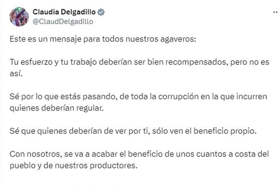 Claudia Delgadillo, candidata a la Gubernatura de Jalisco por la coalición Morena-PT-PVEM-Futuro-Hagamos, difundió el 12 de mayo en redes sociales oficiales un video en el que acusa supuesta corrupción en la defensa del mercado de agave para la industria tequilera.