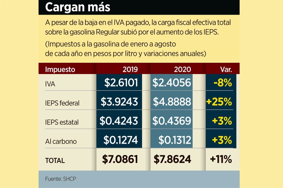 En los primeros ocho meses del año, los impuestos que los consumidores pagaron efectivamente por cada litro de gasolina comprada subieron 11 por ciento, o 77 centavos, respecto al mismo periodo del 2019, arrojó un análisis realizado por Grupo REFORMA.