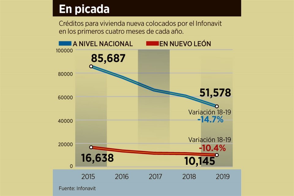 En los primeros cuatro meses del año, la colocación de créditos para vivienda nueva por parte del Infonavit cayó a su nivel más bajo de los últimos cinco años para un mismo periodo.