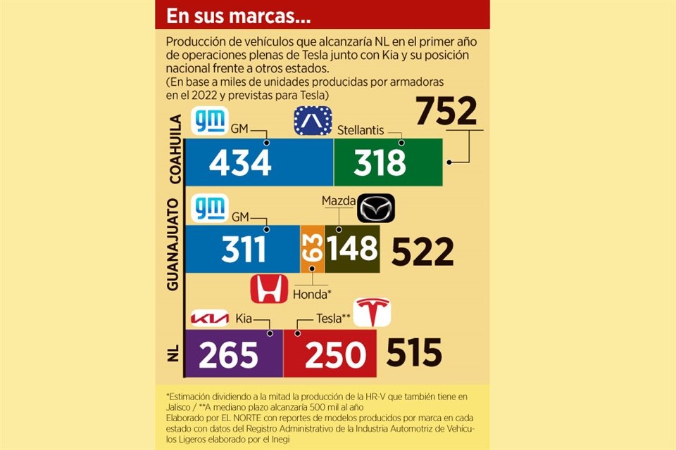 Una vez que Tesla eche a andar su Gigafactory en Santa Catarina, Nuevo León empezará a disputar el primer lugar como productor de vehículos entre todas las entidades del País.