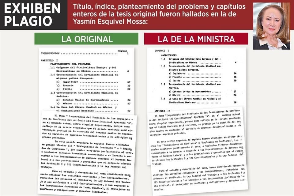 La UNAM confirmó que existe un alto nivel de coincidencias entre la tesis de Licenciatura en Derecho de la ahora Ministra Yasmín Esquivel Mossa y la que un año antes registró otro alumno en 1986. Crédito: Especial.