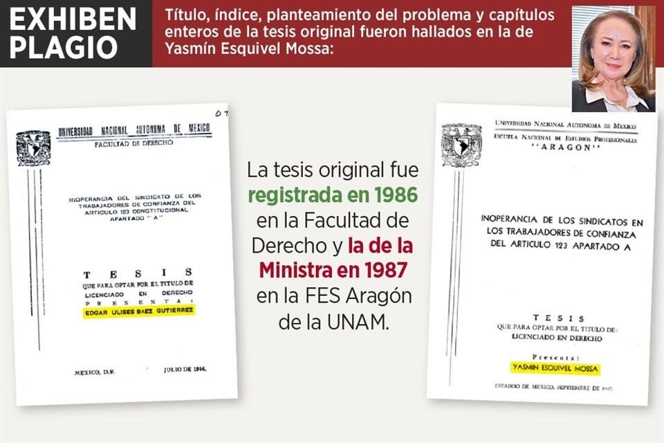La Universidad Nacional Autónoma de México (UNAM) confirmó que existe un "alto nivel de coincidencias" entre la tesis con la que la ahora Ministra Yasmín Esquivel Mossa obtuvo su título de Licenciada en Derecho en 1987, y la que un año antes registró otro alumno, Edgar Ulises Báez Gutiérrez.