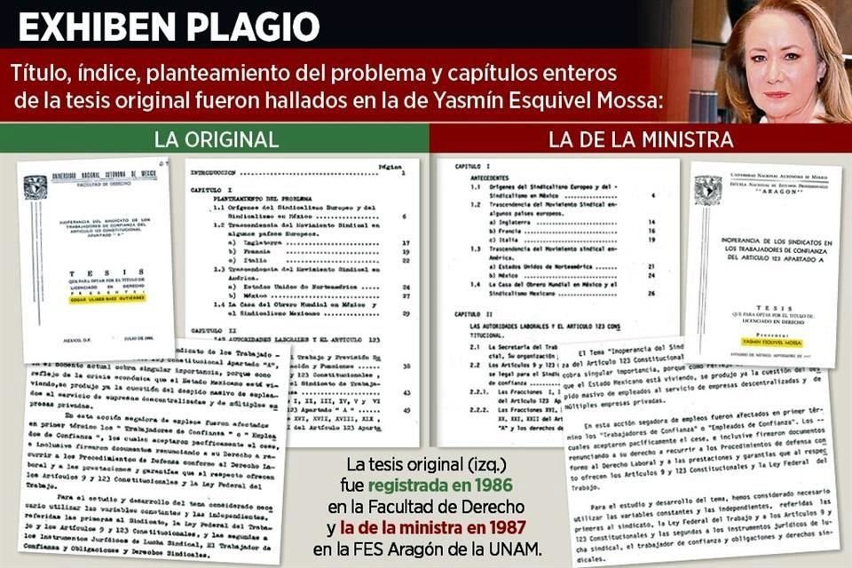 La Universidad Nacional Autónoma de México (UNAM) confirmó que existe un "alto nivel de coincidencias" entre la tesis con la que la ahora Ministra Yasmín Esquivel Mossa obtuvo su título de Licenciada en Derecho en 1987, y la que un año antes registró otro alumno, Edgar Ulises Báez Gutiérrez.