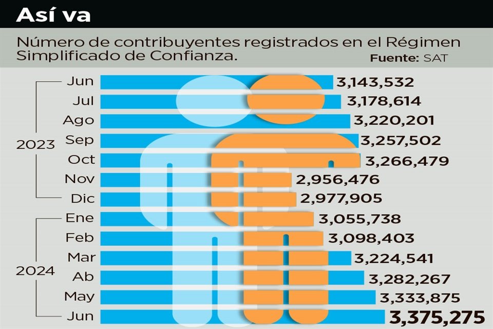 En junio pasado, el número de contribuyentes bajo el Régimen Simplificado de Confianza (Resico) se ubicó en 3 millones 375 mil 275, 7.3 por ciento más en su comparación anual, de acuerdo con datos del Servicio de Administración Tributaria (SAT).