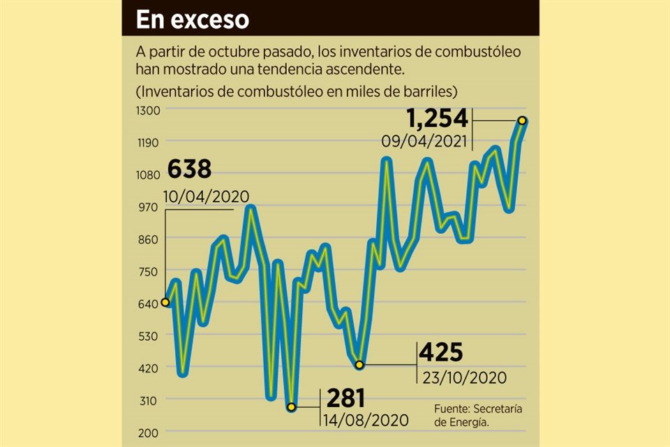 El incremento en el proceso de crudo en las refinerías de Pemex y la limitada demanda de combustóleo ha llevado a que se dispare el inventario de este petrolífero.