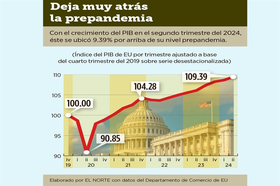 Durante el segundo trimestre del 2024, el PIB de Estados Unidos creció 2.84 por ciento a tasa anualizada, más del 1.9 por ciento que esperaba el consenso de los analistas, según lo publicado por briefing.com, y también a un ritmo más veloz que el 1.41 por ciento registrado en el primer trimestre, reportó preliminarmente ayer el Departamento de Comercio.