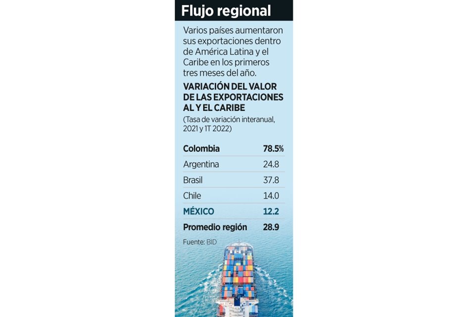 En el primer trimestre, las exportaciones mexicanas a la región América Latina y el Caribe crecieron 12.2 por ciento anual, muy por debajo del 28.9 por ciento que tuvo la zona en promedio, de acuerdo con el Banco Interamericano de Desarrollo (BID).
