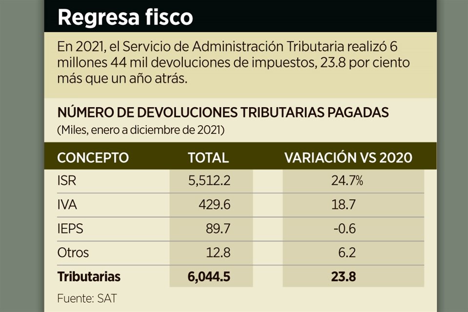 Durante 2021, el Servicio de Administración Tributaria (SAT) devolvió a los contribuyentes 711 mil 822 millones de pesos, 8.4 por ciento más que en 2020.