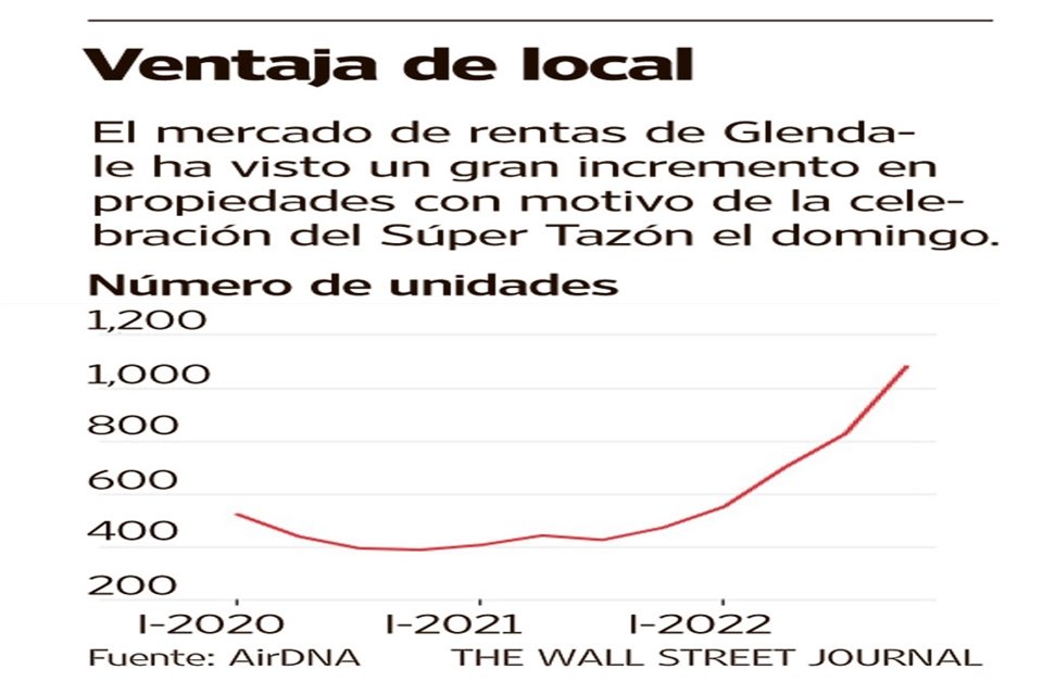 El precio promedio de las entradas para asistir al Súper Tazón 2023 en Glendale, Arizona, en el área metropolitana de Phoenix, ronda los 9 mil dólares, de acuerdo con TicketIQ, una plataforma de boletos de mercado secundario. Si cuesta tanto entrar para ver a las Águilas de Philadelphia jugar contra los Jefes de Kansas City, ¿cuánto pagarán los fanáticos para quedarse en un hospedaje cerca del Estadio State Farm?