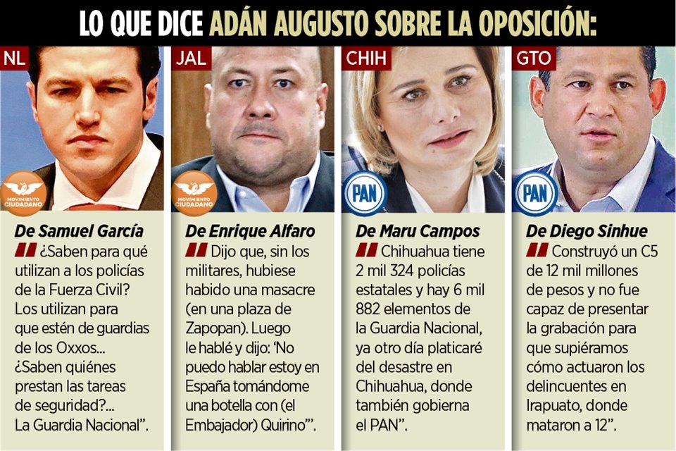 Al arremeter ayer contra MC y el PAN porque rechazaron la reforma que extiende el plazo de las Fuerzas Armadas en labores de seguridad, el Secretario de Gobernación, Adán Augusto López, tronó contra el Gobernador Samuel García y Fuerza Civil.