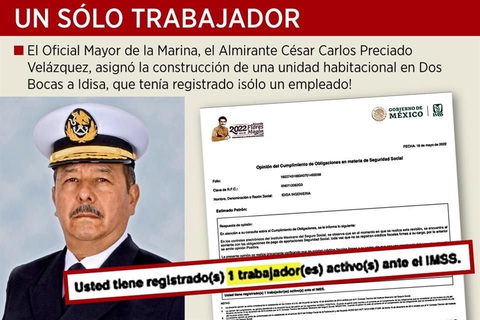 La Secretaría de Marina otorgó un contrato por 223 millones de pesos para la construcción de la unidad habitacional naval en Dos Bocas, Tabasco, a la empresa Idisa Ingeniería SA de CV, cuyo dueño es José Fernando Montes de Oca Siliceo, actual directivo del área de Recursos Humanos de Petróleos Mexicanos.