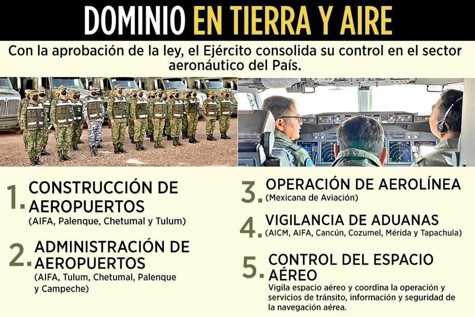 El Ejército controlará toda la cadena de operación aeronáutica tras la aprobación ayer de la Ley de Protección del Espacio Aéreo Mexicano, con la que la Sedena queda como la autoridad encargada de vigilar y dar protección al espacio aéreo mexicano en materia de Seguridad Nacional.
