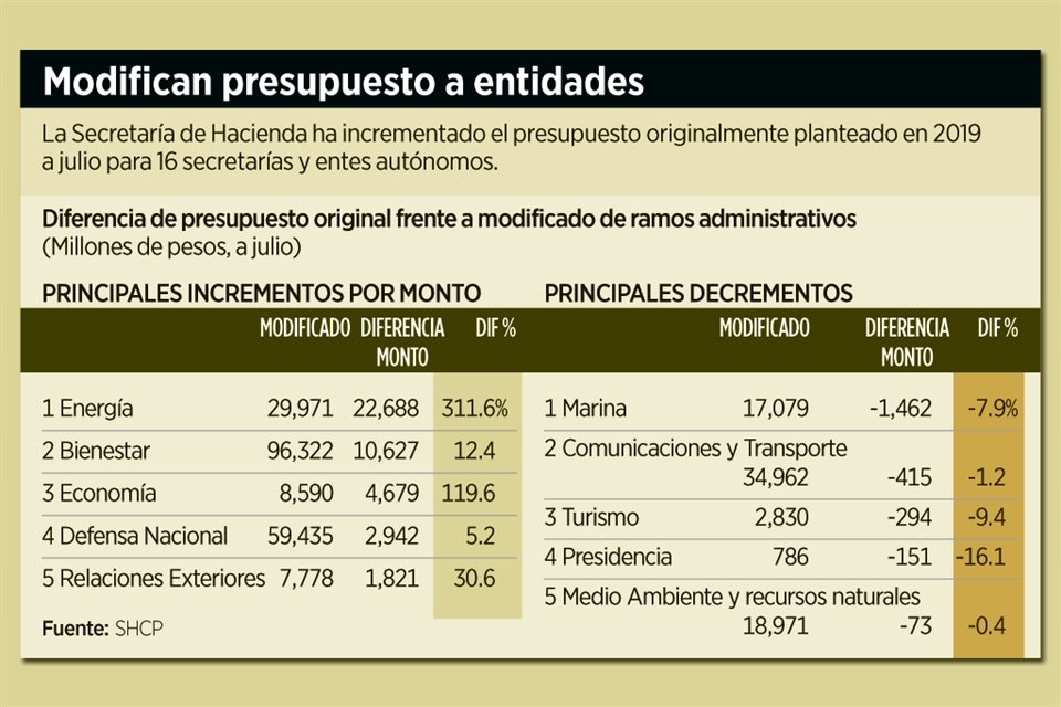 De enero a julio de 2019, el gasto original programado para las dependencias federales se ha incrementado en 46 mil 771 millones de pesos, y los principales ajustes al alza son para las secretarías de Energía y Economía.