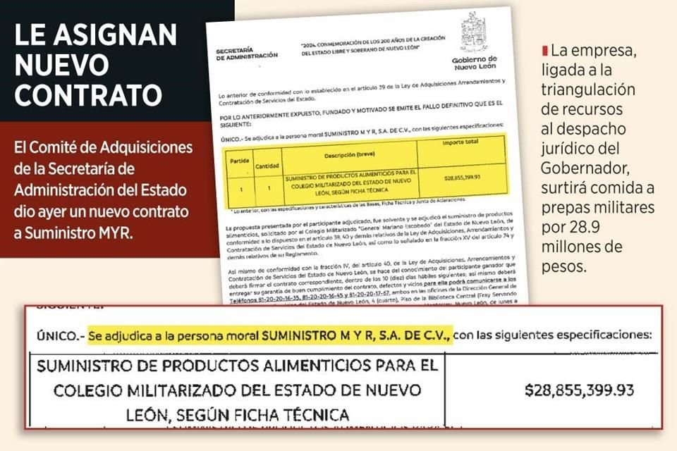 Suministro MYR, la empresa favorita de la Administración actual de NL y que está ligada con la triangulación de recursos del erario al despacho jurídico del Gobernador Samuel García, obtuvo un nuevo contrato millonario del estado, ahora por 28.9 millones de pesos.