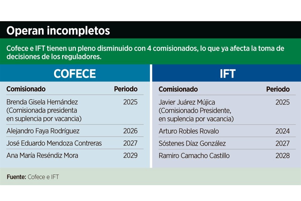 La falta de nombramientos en los Plenos de la Comisión Federal de Competencia Económica (Cofece) y el Instituto Federal de Telecomunicaciones (IFT) debilita la función de los organismos autónomos debido a que se ven impedidos de realizar diversas funciones, advierten expertos.