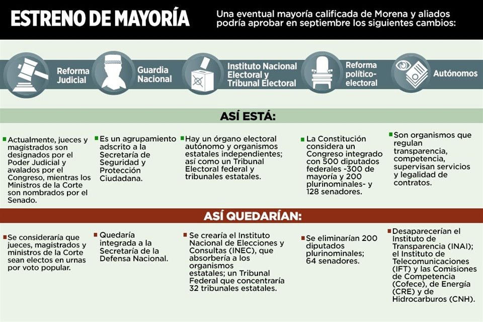Legisladores morenistas anunciaron ayer que la nueva mayoría legislativa electa el pasado domingo 2, debutará en septiembre con la reforma judicial, que propone elegir en urnas a Ministros de la Corte, y también el cambio del INE por otro instituto electoral.