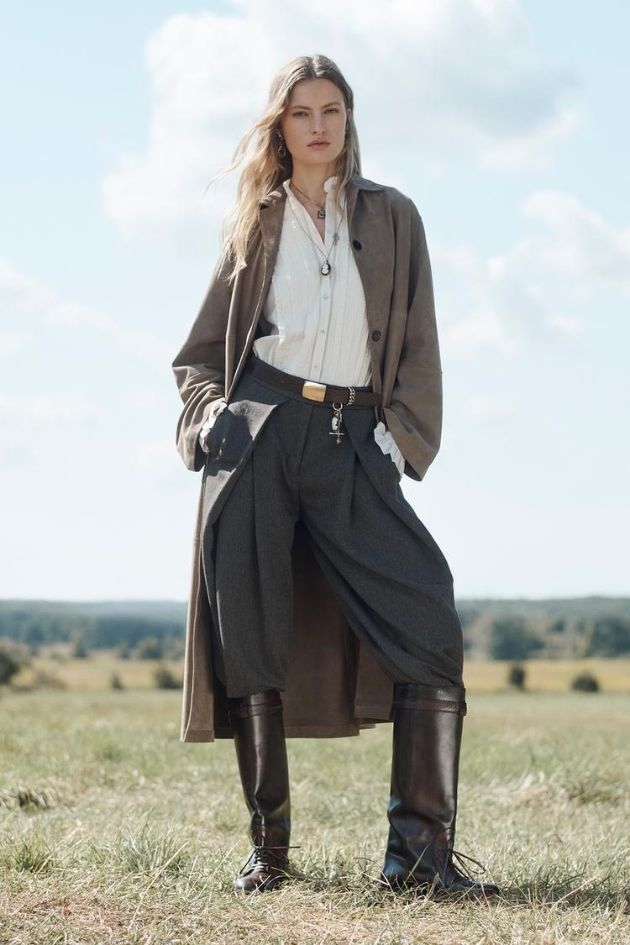 Para una comunidad de hombres que prefieren los sacos abrigadores, aquí un ejemplo de cualidades amplias, en colores boscosos y siguiendo un acercamiento a la trama Príncipe de Gales. Subraya tu estilo con una gran bufanda y pantalones de piel en el color de moda.