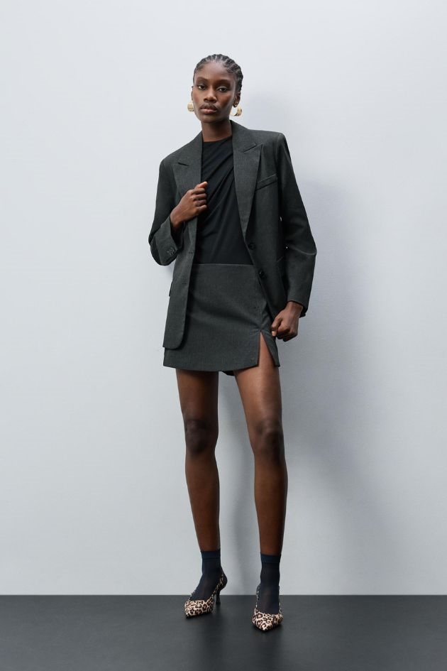 Un traje de dos piezas de lana en color gris puede ser la mejor opción para vestir en cualquier temporada y ocasión. Elige falda larga, corta, incluso midi, adecua tu traje a la reunión y a la personalidad que deseas proyectar.