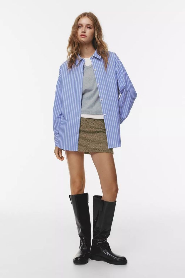 Una blusa azul en rayas finas o medianas es la mejor prenda para combinar con trajes sastre formales, con faldas de corte clásico y hasta con prendas oversized de aire relajado. Tú eliges tu estilo.