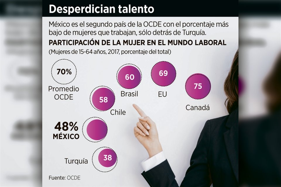 La participación de las mujeres en el ámbito laboral de México es la segunda más baja entre los países de la Organización para la Cooperación y el Desarrollo Económicos (OCDE).