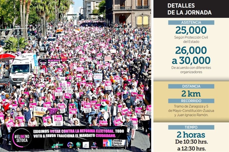 Con pancartas y mensajes, miles de ciudadanos participaron en la marcha en defensa del INE en el Centro de Monterrey.