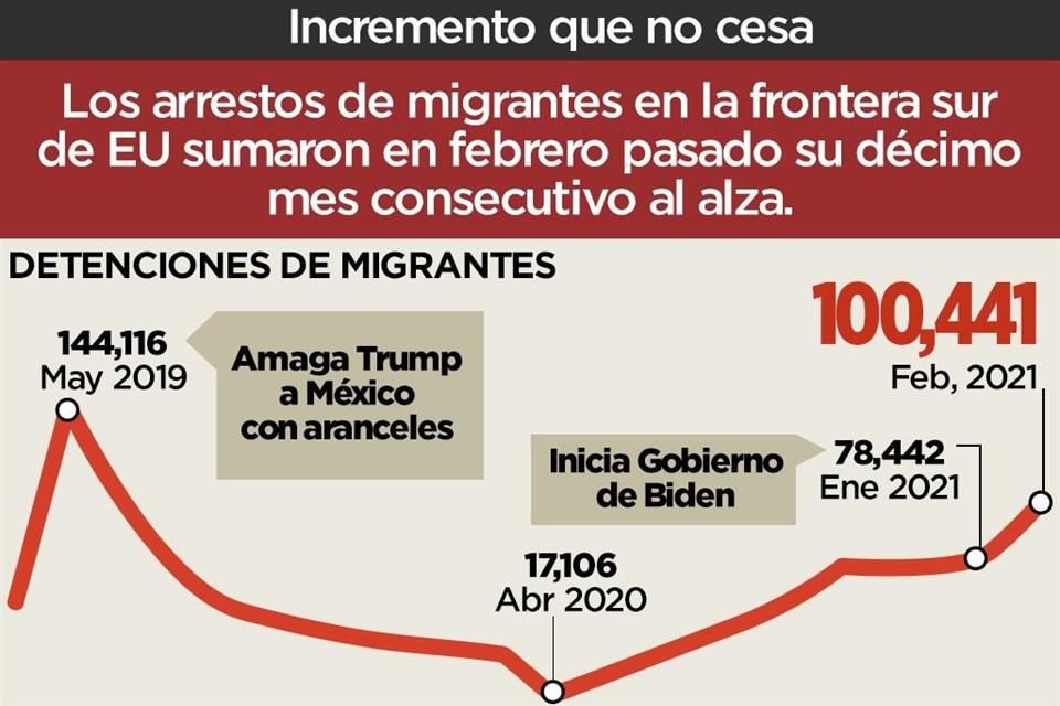 Según estimaciones de la CBP, para marzo podría haber 120 mil arrestos de migrantes. Crédito: Especial.