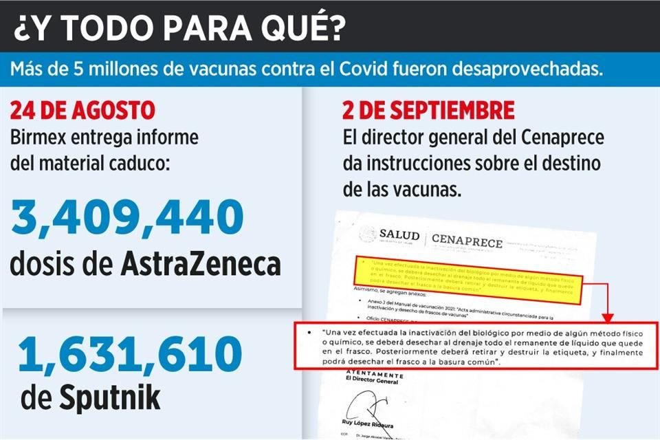 Cinco millones 41 mil 50 vacunas contra Covid-19 de las marcas AstraZeneca y Sputnik serán tiradas al drenaje por autoridades sanitarias, debido a que caducaron en junio pasado.