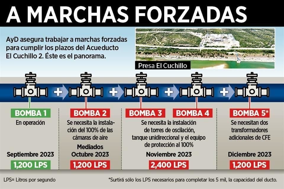 Tres semanas después de la "inauguración" del Acueducto El Cuchillo 2, el director de Agua y Drenaje, Juan Ignacio Barragán, admitió ayer que se trabaja a marchas forzadas para terminar la obra completa en diciembre y cumplir los plazos de aportación gradual de agua a la zona metropolitana.