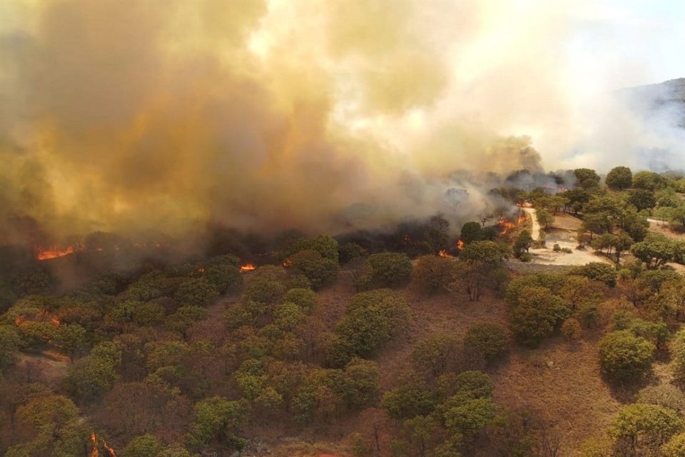 Incendio en el bosque La Primavera, a espaldas del fraccionamiento El Roble, genera una columna de humo que se ve en gran parte de la ZMG. Crédito: Renee Pérez
