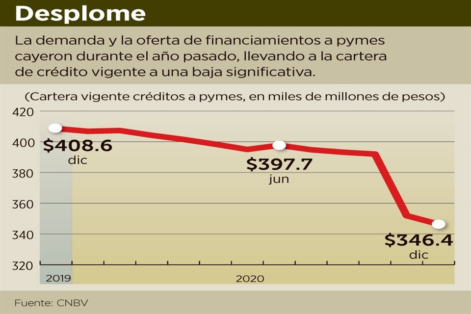 Al cierre de 2020, la cartera de crédito vigente de la banca comercial a pequeñas y medianas empresas (pymes) cayó 15.2 por ciento en su comparación anual ante la incertidumbre y riesgo que representa ese segmento empresarial, según datos de la Comisión Nacional Bancaria y de Valores.