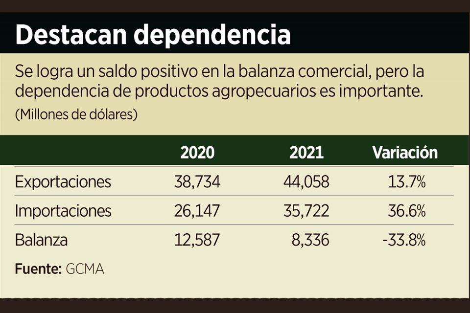 El sector agroalimentario alcanzó un superávit comercial por 8 mil 336 millones de dólares al cierre de 2021, sin embargo, dicho saldo fue menor en 33.8 por ciento contra el año anterior.