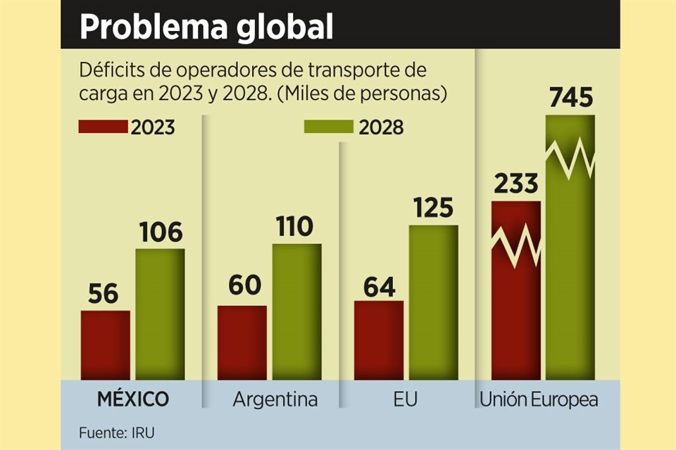 El problema de escasez de operadores de transporte de carga en México se agravará para el 2028, al pasar de 56 mil conductores que actualmente no pueden cubrir el sector a 106 mil en ese año, un alza de 89 por ciento en menos de cinco años, de acuerdo con un análisis de la Organización Internacional para el Transporte por Carretera (IRU, por sus siglas en inglés).