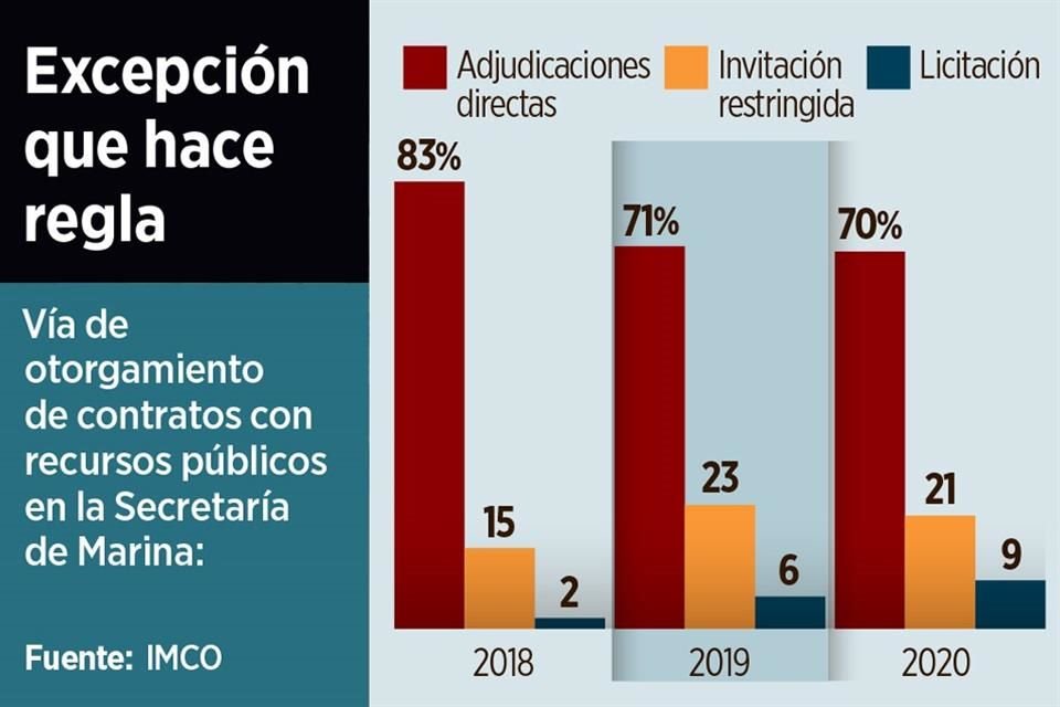 En 99 por ciento del dinero gastado por la Secretaría de Marina en contratos entre 2018 y 2020 no hubo licitación pública, de acuerdo con un reporte del Instituto Mexicano para la Competitividad (IMCO).