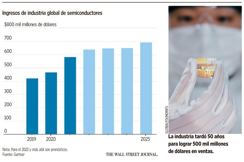 Las empresas de chips acaban de tener el mejor año de ventas en su historia -gracias a una escasez mundial de semiconductores y una creciente demanda- y los ejecutivos de la industria esperan que ese total se duplique en menos de una década, a más de un millón de millones de dólares.