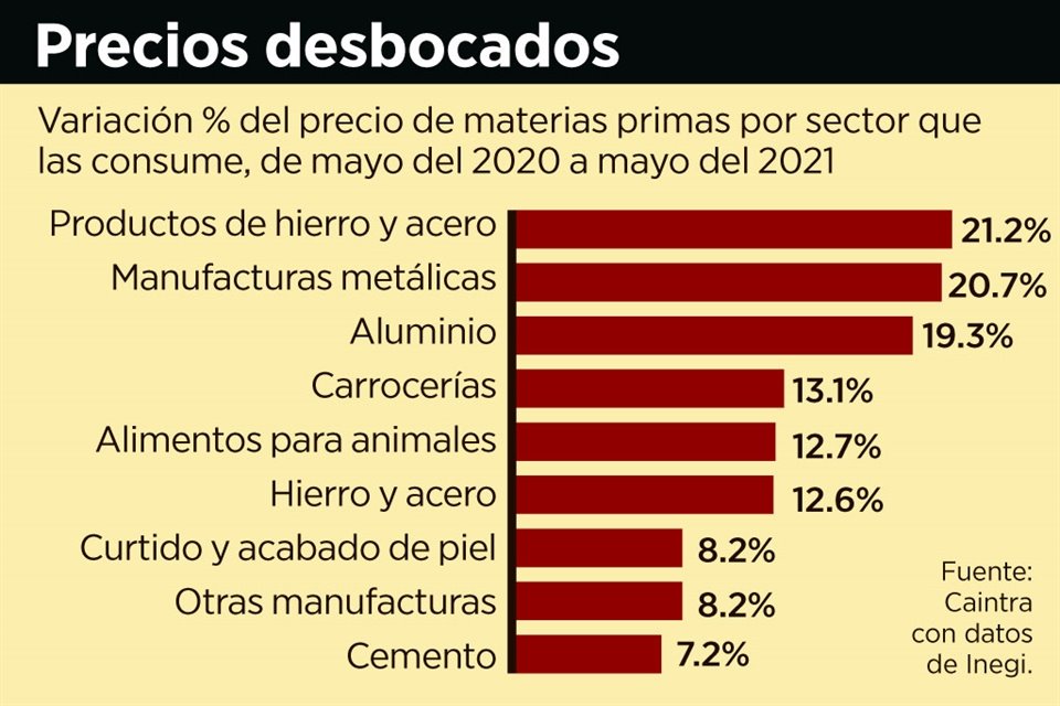 Con las disrupciones en las cadenas de suministros, en mayo pasado los fabricantes de productos de hierro y acero observaron un incremento promedio en los precios de sus materias primas de 21.2 por ciento anual, y los fabricantes de estructuras metálicas uno de 20.7 por ciento, reportó la Caintra.