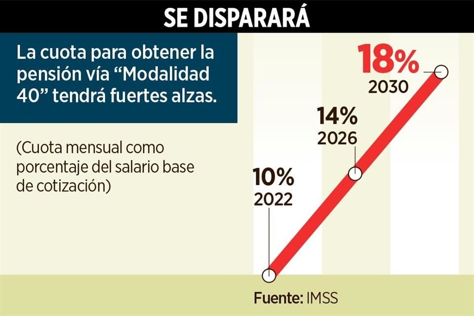 El costo de la llamada "Modalidad 40" para las pensiones aumentará hasta 10.8 por ciento a partir del próximo año tras las modificaciones a la Ley del Seguro Social del IMSS, que entrarán en vigor el 1 de enero de 2023.