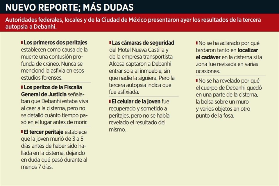 Lejos de esclarecer las interrogantes que envuelven la desaparición y muerte de Debanhi Escobar, el resultado de la tercera necropsia realizada por peritos de la Ciudad de México y un forense guatemalteco enredaron aún más la indagatoria de la Fiscalía General de Justicia estatal.