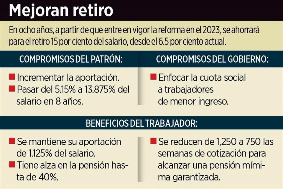 En acuerdo con los sectores obrero y patronal, el Gobierno federal propuso ayer una reforma a la Ley del Seguro Social que modifica el esquema de pensiones, al bajar a 750 las semanas obligatorias de cotización y aumentar el monto de retiro en un 40 por ciento, en el que las empresas absorben el incremento en aportaciones.