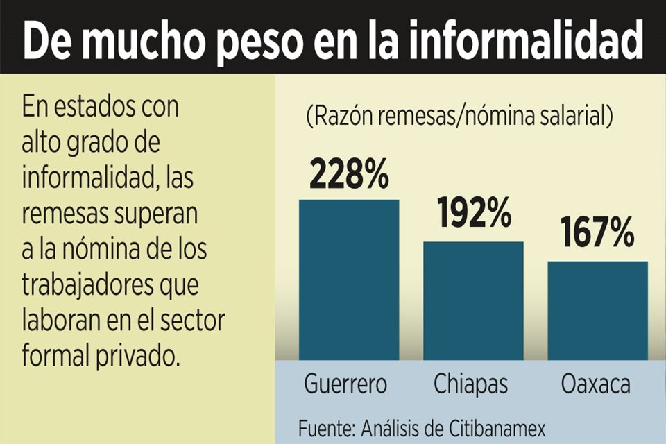 Las remesas recibidas el año pasado fueron equivalentes al 26.4% de la nómina salarial de los trabajadores formales del sector privado registrados ante el IMSS, destacó Citibanamex.