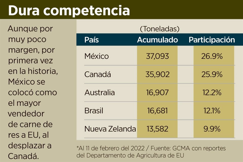 Los ganaderos mexicanos lograron por primera vez convertirse en el principal proveedor extranjero de carne fresca de res a Estados Unidos, al desplazar a Canadá, que por años venía ocupando ese primer sitio.