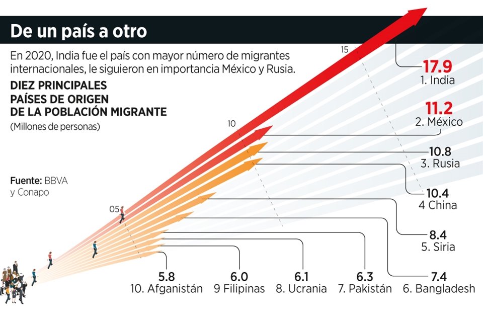 En el grupo de los 10 países con mayor número de migrantes a nivel mundial, México ocupó el segundo lugar con 11.2 millones en 2020, reveló el Anuario de Migración y Remesas 2022.