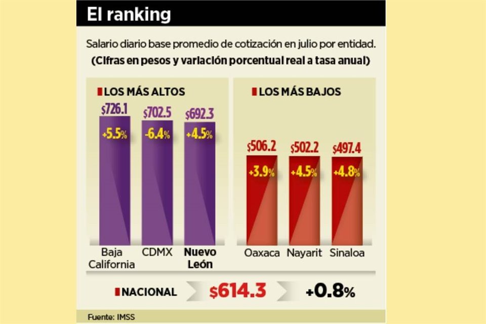 El salario diario base promedio de cotización de Nuevo León se ubicó en 692.32 pesos en julio, 12.7% por arriba del nacional de 614.3 pesos y situándose como el tercero más elevado de entre todas las entidades del País.