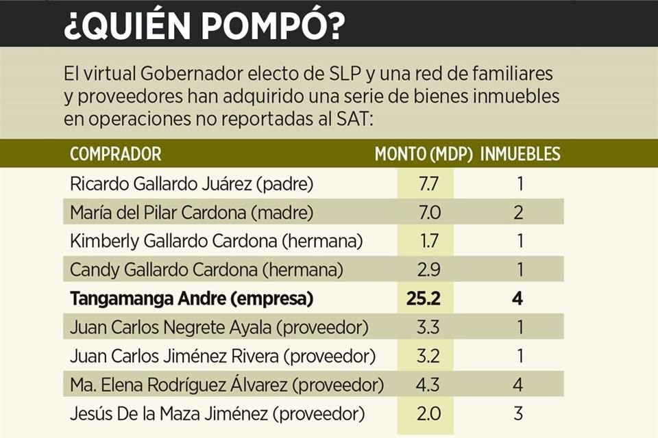 La familia de Ricardo Gallardo Cardona, alias "El Pollo", virtual Gobernador electo de San Luis Potosí, así como empresas y empresarios ligados a él adquirieron durante los últimos 10 años al menos 19 propiedades con un valor conjunto de 58.6 millones de pesos. Dichas operaciones están bajo investigación federal, debido a que no fueron reportadas al fisco.