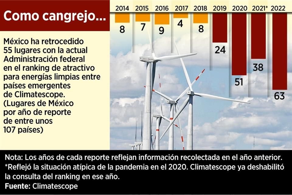 El atractivo de México para inversiones en energías renovables se desplomó en lo que va del sexenio del lugar 8 al 63: una caída de ¡55 escalones!