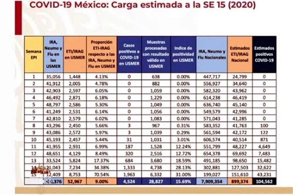 La Secretaría de Salud estima que había 104 mil 562 casos positivos de Covid-19 en el País, hasta la semana 15 de la epidemia, es decir, del 5 al 11 de abril.