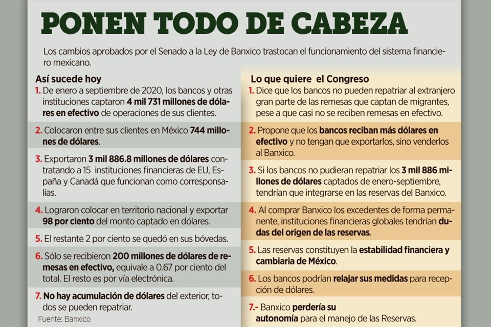 Con los cambios a la Ley del Banco de México (Banxico), aprobados el miércoles por el Senado, no se logrará el objetivo de alcanzar un mejor precio cambiario para los usuarios, pero sí se ponen en riesgo a las reservas internacionales.