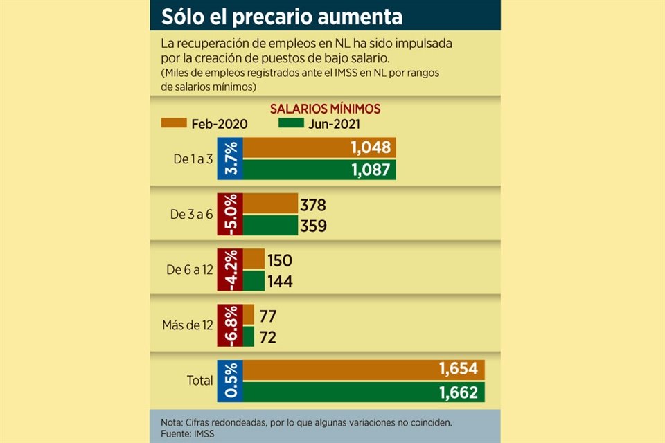 Aunque en junio pasado Nuevo León logró recuperar el nivel de empleos formales previo a la pandemia, por rangos de ingresos los puestos mejor pagados aún no se han restablecido.