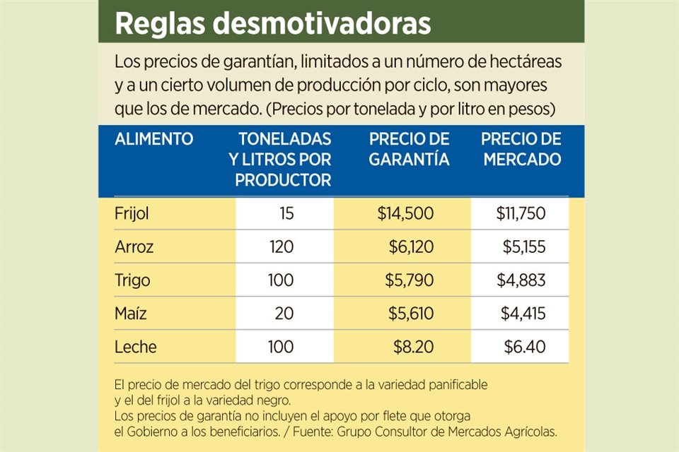 Las reglas del programa Precios de Garantía, diseñado para pequeños productores, inhiben el crecimiento de la productividad del maíz, frijol, trigo, arroz y leche, no obstante que fue lanzado para lograr la autosuficiencia alimentaria, coincidieron analistas y agricultores.