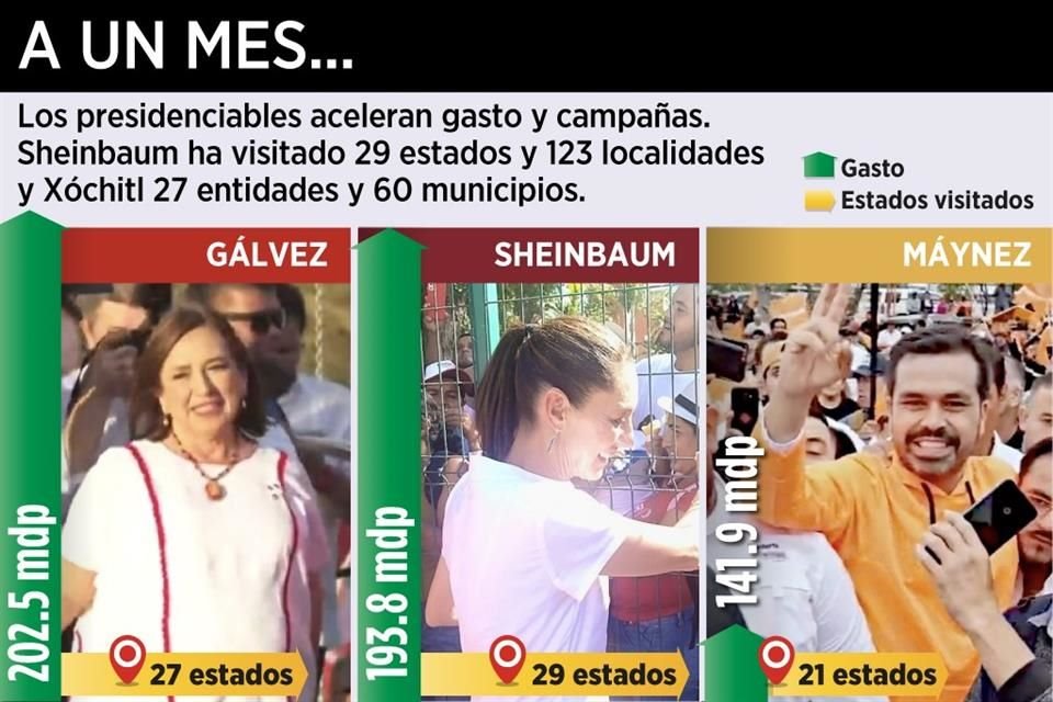 A un mes de la elección, las candidatas y el candidato a la Presidencia de la República han reportado al INE gastos por 538 millones 345 mil 196 pesos en 61 días de campaña.