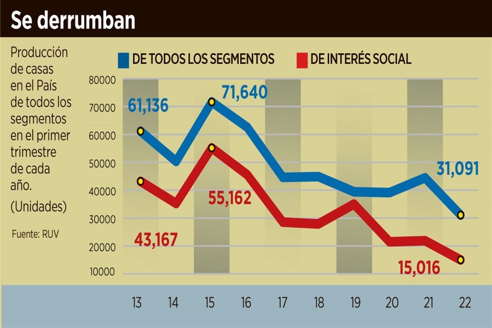 La producción nacional de viviendas no levanta, en especial la de interés social -con valor menor a 585 mil pesos-, y lo peor: los desarrolladores están desechando nuevos proyectos.